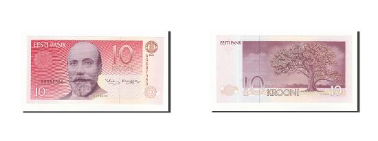 | | Banknote, Estonia, 10 Krooni, 1991, KM:72a, UNC(65-70) | | | 1991. Serial # prefix A., J. Hurt at left center., Tamme-lauri oak tree at Urvaste at right., Purple and red on multicolor underprint. | | FEATURES |