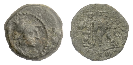 Ancient Greek SELEUKID KINGS of SYRIA Antiochos VII Euergetes (Sidetes). 138-129 BC AE denomination C, Ake-Ptolemaïs mint, dated SE 177 (136/5 BC) Head of Athena in Corinthian helmet, right / Owl standing facing, IOP (date) below 3.02 g, 16-17 mm SC 2119.1; HGC 9, 1102 ex WKR collection Scarce (R1 per HGC) |