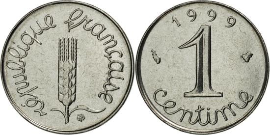 | | Coin, France, Épi, Centime, 1999, Paris, , Stainless Steel, KM:928 | | | Épi, Cursive legend surrounds grain sprig, Cursive denomination, date at top, 1991-1993 dated coins, non-Proof, exist in both coin and medal alignment. Values given here are for medal alignment examples. Pieces struck in coin alignment have been traded for as much as $50.00. | | FEATURES |
