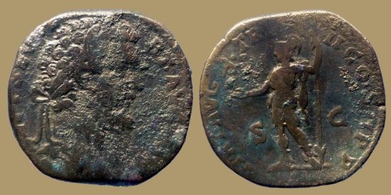 Virtus standing left, holding spear in his left hand and Victory in his right.