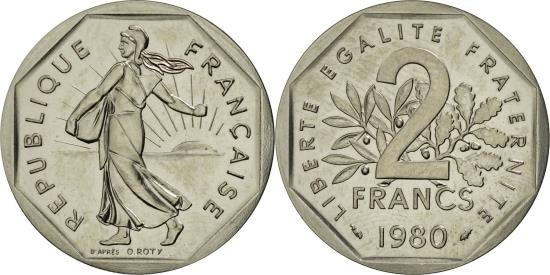 | | Coin, France, 2 Francs, 1980, Paris, , Nickel, KM:P671, Gadoury:123.P1 | | | KM#942. | | FEATURES |