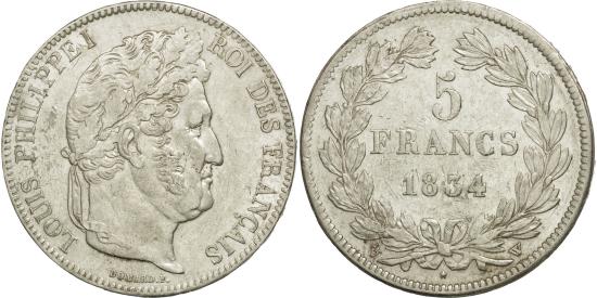 | | Coin, France, Louis-Philippe, 5 Francs, 1834, Lille, , Silver | | | Louis-Philippe, Laureate head right, Mint marks at edge outside wreath | | FEATURES |