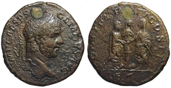 Rev. Caracalla and Geta standing right and left, vis-à-vis, sacrificing over tripod; behind, flute player standing facing with victim.