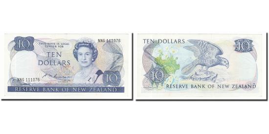 | | Banknote, New Zealand, 10 Dollars, 1985-1989, Undated, KM:172b, AU(55-58) | | | Signature S. T. Russell with title: GOVERNOR. (1985-89)., Mature portrait of Queen Elizabeth II., Kea at center and plants., Blue on multicolor underprint. | | FEATURES |