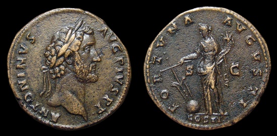 Imperial Rome, Antoninus Pius. AD 138 - 161. AE-Sestertius, AD 139. Rome. 28.40g. 12h. ANTONINVS AVG PIVS PP, his laureate head rt. / FORTVNA AVGVSTI COS II, Fortuna standing lt., holding a rudder set on a globe and a cornucopia, S-C in fields. BMCRE 1160; RIC -. Near EF with lovely surfaces and detail. Superb portrait of this peace time emperor.