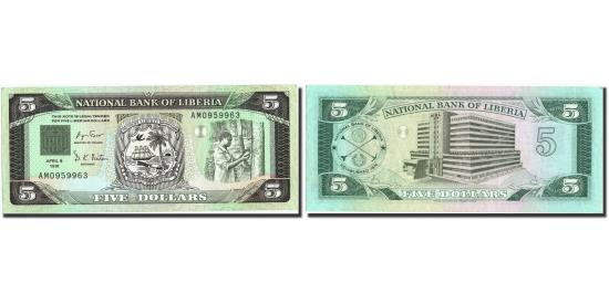 | | Banknote, Liberia, 5 Dollars, 1991, 1991-04-06, KM:20, UNC(65-70) | | | Latent image star at left, arms at center, tapping trees at right., National Bank building., Black and deep green on multicolor underprint., Deep green on multicolor underprint. | | FEATURES |