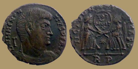 Two Victories, standing facing each other, holding shield inscribed VOT-V-MVLT-X between them