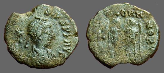 Theodosius I AE3 16mm) 2 emperors stg together.