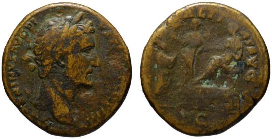 Antoninus Pius. AD 138-161. Æ Sestertius (32mm, 25.19 g.) Rome mint, struck AD 147/8. Obv. Laureate head right. Rev. Antoninus seated left on sella castrensis on raised daïs, extending hand to figure standing right and extending hand to receive it; statue of Liberalitas standing left, holding abacus and cornucopia, on daïs before. RIC III 775 (R) aVF, Brown patina. Rare Antoninus Pius’s fifth liberality was given in honor of his recent vota decennalia, which was also the occasion for celebratory games, the Primi Decennales. |