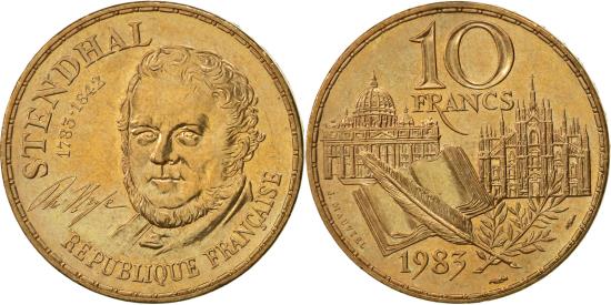 | | Coin, France, Stendhal, 10 Francs, 1983, Paris, , Nickel-Bronze, KM:953 | | | Stendhal, Head 3/4 facing, Quill, branch, book, and buildings divide date and denomination, J. Mauriel | | FEATURES |