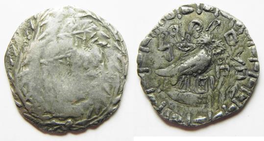 South Arabia. Saba’. AR unit (25mm, 5.40g). Struck 1st century BC-1st century AD. Imitating Athens 'New Style' coinage. Laureate male head r., hair in ringlets; all within wreath. / Owl standing r., head facing, on amphora; ‘cursive legend’ above; monogram to l; Q-E and staff symbol to r. Munro-Hay 1.11i.