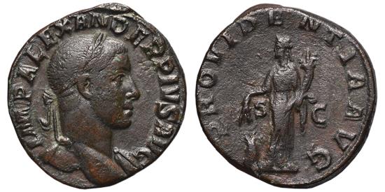 SEVERUS ALEXANDER. Sestertius. 231-235, AD. Rome mint. Ovb/ IMP ALEXANDER PIVS AVG, Laureate bust right, drapery on left shoulder. Rev/ PROVIDENTIA AVG / S-C, Providentia standing front, head turned left, holding corn-ears over modius and cornucopiae. Cat: RIC IV, 642b Bronze (Æ) 21,5g - 30mm. |