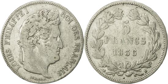 | | Coin, France, Louis-Philippe, 5 Francs, 1836, Lyon, , Silver, KM:749.4 | | | Louis-Philippe, Laureate head right, Mint marks at edge outside wreath | | FEATURES |