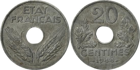 | | Coin, France, État français, 20 Centimes, 1944, Paris, , Zinc | | | État français, Grain sprigs flank center hole, Center hole divides denomination, leaves flank, Thin flan. Struck at Paris Mint. | | FEATURES |