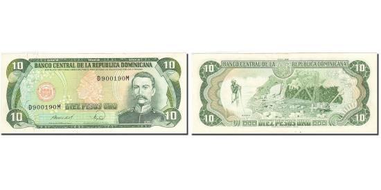| | Banknote, Dominican Republic, 10 Pesos Oro, 1977-1980, 1988, KM:119c, AU(55-58) | | | 1985; 1987; 1988., Mella at right, medallic Liberty head at center. Orange bank seal at left., Quarry mining scene, dates in upper margin., Black and green on multicolor underprint. | | FEATURES |