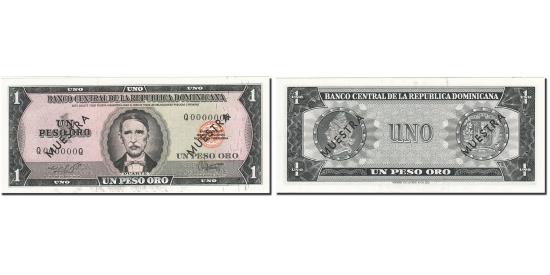 | | Banknote, Dominican Republic, 1 Peso Oro, 1975, 1975-1978, KM:108s, AU(55-58) | | | Specimen with black overprint: ESPECIMEN on each side. Punch hole cancelled., Portrait J. P. Duarte with eyes looking front, black bow tie. Orange bank seal at right. Signature varieties., Medallic portrait of Liberty head at left, arms at right. Dates at center in upper margin., Black on light green and pinkish tan underprint. | | FEATURES |