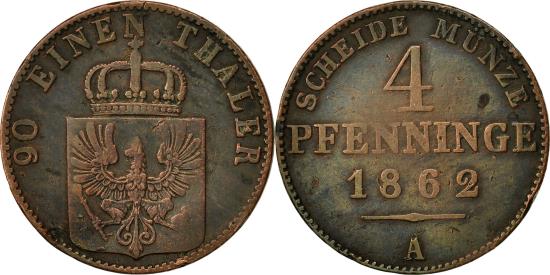 | | Coin, German States, PRUSSIA, Wilhelm I, 4 Pfennig, 1862, Berlin, | | | Crowned shield of eagle arms with FR monogram on breast, 3-line inscription with date, mintmark in exergue, Ref. N-16., 90 EINEN THALER | | FEATURES |