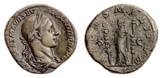 Roman Imperial Severus Alexander. 222-235 AD AE Sestertius Rome mint, struck 225 AD Laureate and draped bust right / Fides standing left, holding a signum in each hand 23.32 g, 29 mm, bronze, rough reverse RIC IV 552; BMCRE 227-8; Sear 7964; [Banti 10] |