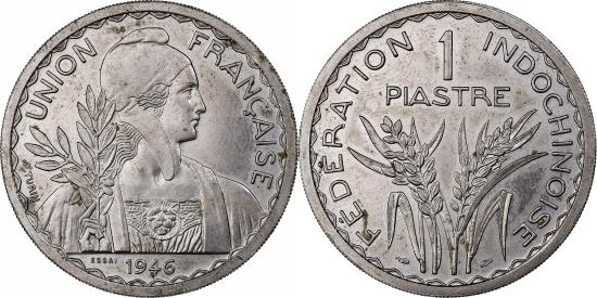 | | French Indochina, 1 Piastre, 1946, Paris, Pattern, Copper-nickel, | | | Bust of Marianne, hair flying, wearing a Phrygian cap and a garment decorated with a lion's head, holding a laurel branch in her right hand, date below., Several sprigs of grain, denomination above., Pattern coin for the 1 Piastre 1946 by Turin, Cleaned specimen, finger prints and slight hairlines in the fields, | | FEATURES |