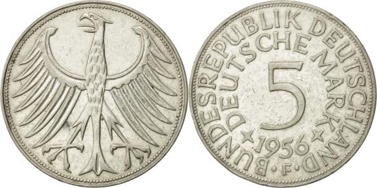 | | Coin, GERMANY - FEDERAL REPUBLIC, 5 Mark, 1956, Stuttgart, , Silver | | | Denomination above date, Large eagle | | FEATURES |