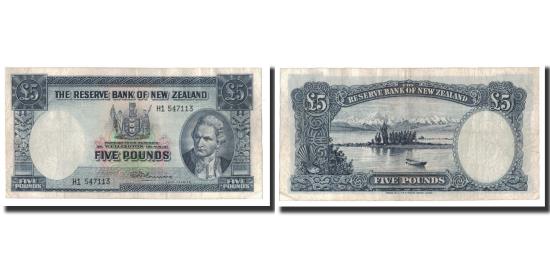 | | Banknote, New Zealand, 5 Pounds, Undated 1940-1967, KM:160d, EF(40-45) | | | As c. With security thread. (1960-67)., Crowned arms at upper center. Portrait of Capt. James Cook at lower right. Signature title: CHIEF CASHIER., Lake Pukaki and Mt. Cook., Blue on multicolor underprint. | | FEATURES |