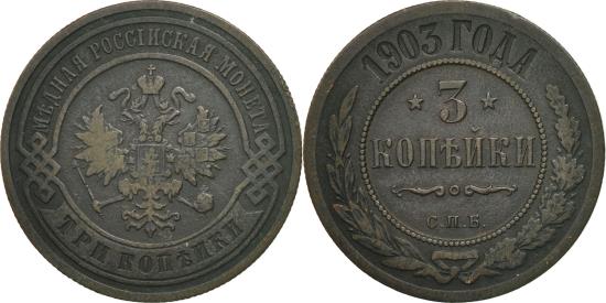 | | Coin, Russia, Nicholas II, 3 Kopeks, 1903, Saint-Petersburg, , Copper | | | Crowned double imperial eagle within circle, Value flanked by stars within beaded circle | | FEATURES |