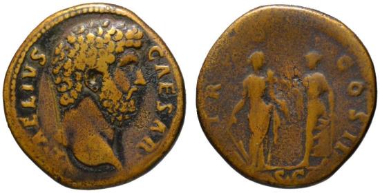 Aelius. Caesar, AD 136-138. Æ Sestertius (32.5mm, 24.96 g.) Rome mint, struck AD 137. Obv. Bare head right. Rev. Fortuna standing right, holding rudder and cornucopia, vis-à-vis Spes standing left, holding flower and hem of skirt. RIC II 1054 (Hadrian) VF, guaranteed much better in hand than pictured. Minor cleaning marks on obverse. Brown patina. The rarest reverse type of all Aelius sestertii series, Banti only records one example. Pleasant bold portrait. |
