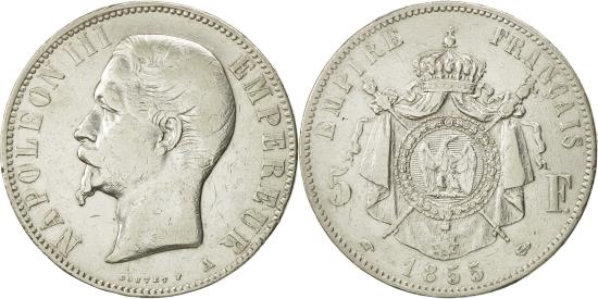 | | Coin, France, Napoleon III, Napoléon III, 5 Francs, 1855, Paris, | | | Napoléon III, Head left, Crowned and mantled arms divide denomination, NAPOLEON III EMPEREUR | | FEATURES |