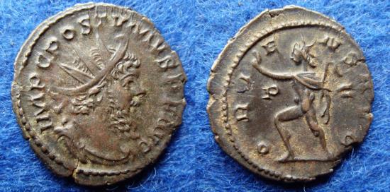 Postumus. Romano-Gallic Emperor, AD 260-269. Antoninianus (2,98g). Treveri (Trier) mint. 6th emission, AD 268. Radiate, draped, and cuirassed bust right / Sol advancing left, extending right hand, holding whip in left hand; P to left. RIC V 316; Mairat 166-7; AGK 49; RSC 213b. Near EF. |