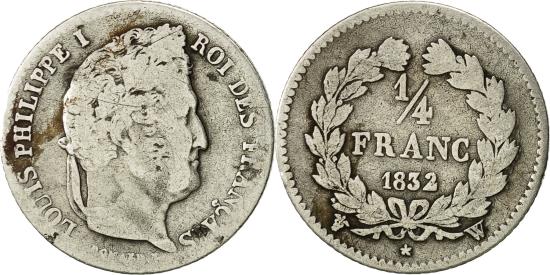 | | Coin, France, Louis-Philippe, 1/4 Franc, 1832, Lille, , Silver | | | Louis-Philippe, Laureate head right, Denomination within wreath | | FEATURES |