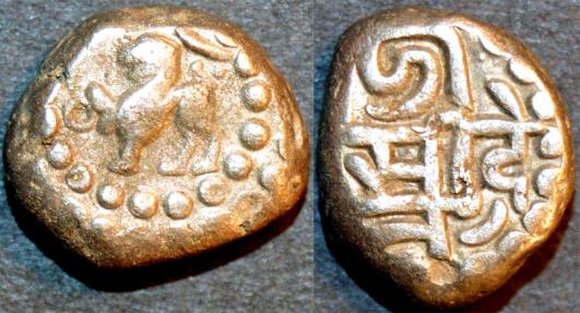 A dumpy coin, about 5 mm thick, a choice specimen of a SCARCE coin! This type has been incorrectly attributed by Mitchiner to the Pallava king Narasimha (see MNI 696). |