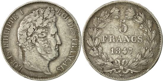 | | Coin, France, Louis-Philippe, 5 Francs, 1847, Strasbourg, , Silver | | | Louis-Philippe, Laureate head right, Mint marks at edge outside wreath | | FEATURES |