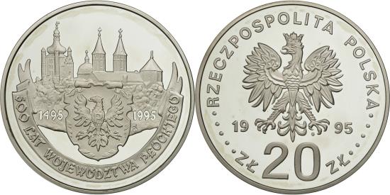 | | Coin, Poland, 20 Zlotych, 1995, , Silver, KM:288 | | | Imperial eagle above value, Eagle on shield divides dates, castle in background | | FEATURES |