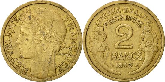 | | Coin, France, Morlon, 2 Francs, 1935, Paris, , Aluminum-Bronze, KM:886 | | | Morlon, Laureate head left, Denomination and date flanked by cornucopias | | FEATURES |