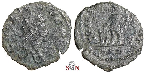 Gallienus Antoninianus, struck AD 265-267 at Rome mint. Obv: GALLIENVS AVG, radiate head right. Rev: CONSERVAT PIETAT / XII (in exergue), Gallienus, in military attire, standing left, extending right hand to