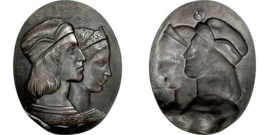 | | Italy, Medal, Raphael and La Fornarina, Bronze, | | | Busts of Raphael and La Fornarina on the right., Incuse., With a small ring on the reverse to hang it on the wall. | | FEATURES |