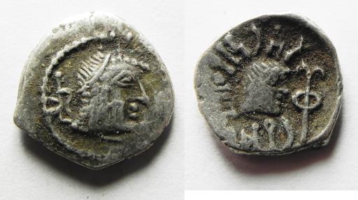 Raydan mint. Long-haired head r.; South arabian letter above and on cheek; South Arabian monogram to l. / Small long-hired head r.; 'sceptre' symbol to r. Munro-Hay 3.24i.