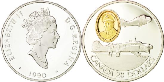 | | Coin, Canada, Elizabeth II, 20 Dollars, 1990, Royal Canadian Mint, Ottawa | | | Crowned head right, date below, Anson and Harvard, Air Marshal Robert Leckie in cameo, denomination below | | FEATURES |