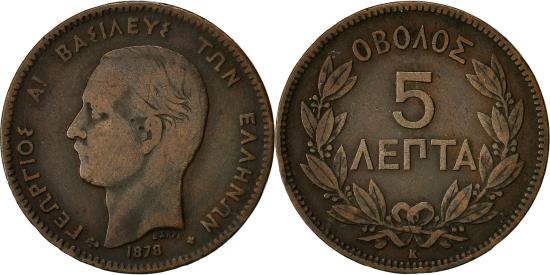 | | Coin, Greece, George I, 5 Lepta, 1878, , Copper, KM:54 | | | Old head left, Denomination within wreath | | FEATURES |