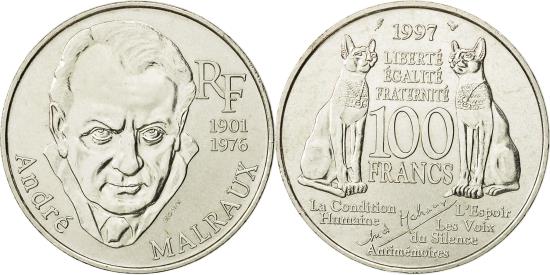 | | Coin, France, André Malraux, 100 Francs, 1997, , Silver, KM:1188 | | | André Malraux, Andr, Two cats flanking denomination | | FEATURES |