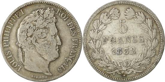 | | Coin, France, Louis-Philippe, 5 Francs, 1832, Limoges, , Silver | | | Louis-Philippe, Laureate head right, Mint marks at edge outside wreath | | FEATURES |