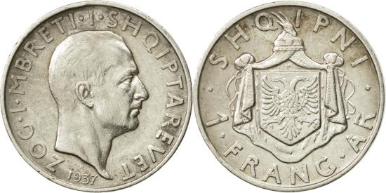 Coin, Albania, Zog I, Frang Ar, 1937, Rome, , Silver, KM:16Coin, Albania, Zog I, Frang Ar, 1937, Rome, , Silver, KM:16