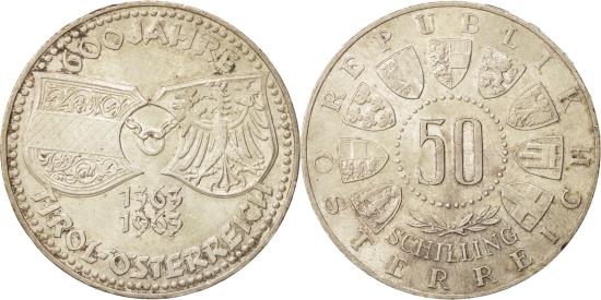 | | Coin, Austria, 50 Schilling, 1963, , Silver, KM:2894 | | | Value within beaded circle, small spray below, 3/4 circle of shields surrounding, Arms of Tyrol and Austria above two dates, Arnold Hartig | | FEATURES |
