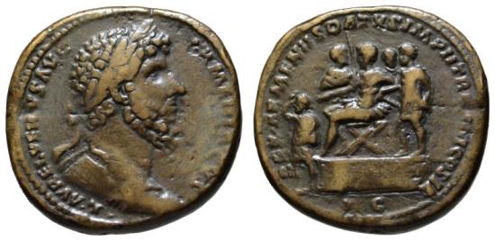 Lucius Verus. AD 161-169. Æ Sestertius (34mm, 25.85 g.) Rome mint, struck AD 164 Obv. Laureate and cuirassed bust right. Rev. Lucius Verus, in military dress, seated left on curule chair, set on low platform, with right hand placing diadem on head of King Sohaemus, left hand at side: the king stands left and raises right hand to adjust diadem: on platform by Verus, three officers, one on left, standing right, holding spear in left hand, two on right, one standing facing, the other, standing left. RIC III 1375 (Aurelius) Bold VF+, Minor cleaning scratches. Attractive warm leather-brown patina. Very rare and of great historical interest. |