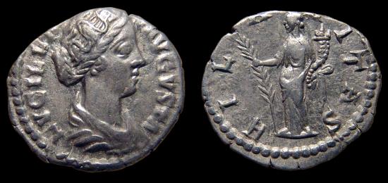 Roman Imperial, Lucilla, the daughter of Marcus Aurelius and wife of Lucius Verius. Augusta, AD 161 - 169. AR Denarius, struck AD 164-6. Rome. (2.60g. 18mm. 1h). LVCILLA AVGVSTA, her draped bust rt. / HILARITAS, Hilaritas standing lt., holding a palm frond and a cornucopia. RIC 769; BMCRE 338; RSC 28; MIR 31. VF.