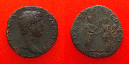 Rev.: FORTVNAE REDVCI / SC Hadrian standing right, holding roll, clasping right hands with fortuna standing left holding cornucopiae and rudder.