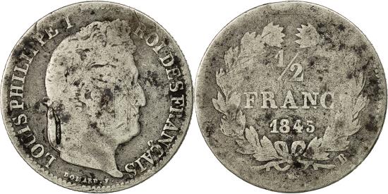 | | Coin, France, Louis-Philippe, 1/2 Franc, 1845, Rouen, , Silver,KM 741.2 | | | Louis-Philippe, Laureate head right, Denomination within wreath | | FEATURES |