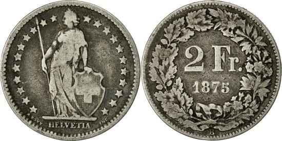 | | Coin, Switzerland, 2 Francs, 1875, Bern, , Silver, KM:21 | | | Standing Helvetia with lance and shield within star border, Value, date within wreath | | FEATURES |