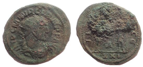 | Carus. A.D. 282-283. Æ Antoninianus 23 mm, 3.4 gm. Obv: IMP C M AVR CARVS P F AVG, radiate, draped and cuirassed bust of Carus right. Rev: VIRTVS AV-GG, Carus standing facing, head right, holding scepter and receiving globe from Carinus standing facing, head left, holding scepter; TR//XXI. RIC 128; Pink, p. 57, series 1. |