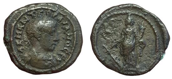 Obv: Α Κ Μ ΑΝ ΓΟΡΔΙΑΝΟϹ ƐΥϹƐΒ, laureate and cuirassed bust of Gordian III, r., seen from front, with gorgoneion Rev: Tyche standing l., holding rudder and cornucopia, LƐ = year 5